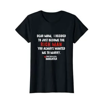 Show moreStep into your power with our Womens Dear Mom, I Am The Rich Man You Wanted Me To Marry T-Shirt. Designed for the career-driven woman who refuses to conform to societal expectations, this t-shirt is a fun and bold statement piece. Made with lightweight fabric and tailored for a classic fit, it promises not only comfort but also a flattering silhouette. Each time you wear it, you’re not just making a fashion statement; you’re declaring your independence, ambition, and a zest for life that prioritizes your own happiness over conventional norms.