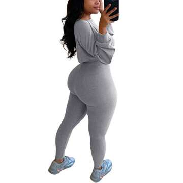 Womens Fall 2 Piece Outfits Sweatsuit Set Long Sleeve Ribbed Crop Top Skinny Long Pant Tracksuit Jogger Set Sportwear Grey