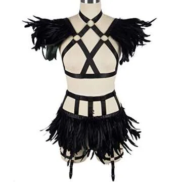 Womens Feathers Body Harness Lingerie Full Strappy Cage Garter Belt Set Elastic Hollow Top Bra Punk Gothic Festival Rave Wear (Black Gold o76+p48)
