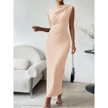 Womens Formal Long Dresses Elegant Ruched Bodycon Sleeveless Boat Neck Maxi Dress with Slit Wedding Guest Cocktail Party Beige L