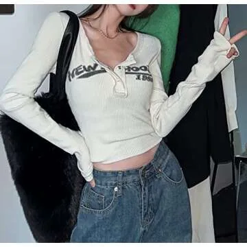 Show more Introducing the Womens Letter Print Crop Top Y2K E-Girls 90s Long Sleeve Ribbed Shirt, a fashion statement that encapsulates the spirit of the 2000s with its stylish aesthetic. Made from a premium cotton blend, this top is designed to keep you feeling comfortable and breathable all day long. The eye-catching graphic print not only showcases your unique style but also sets you apart in any crowd. Whether you layer it up for a cozy day out or sport it as a chic standalone piece, this versatile blouse is perfect for all occasions. From parties to beach vacations, it effortlessly combines functionality with flair.