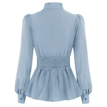 The long lantern sleeves of this blouse are complemented by decorative buttons, enhancing its vintage aesthetic and flair. With a unique peplum silhouette that features a smocked back waistline and a ruffled hem, this top not only accentuates your figure but also brings a sophisticated edge to your wardrobe. It's designed to be the center of attention; expect compliments when you wear it!