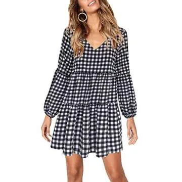 Womens Long Sleeve Shift Dress V Neck Plaid Cute Fall Swing Dress White L