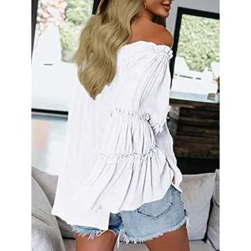 Womens Off The Shoulder Long Bell Sleeve Tops Flared Casual Loose Blouse (Z White, Medium)