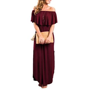 Show moreIntroducing the Womens Off The Shoulder Ruffle Party Dresses Side Split Beach Maxi Dress, a stunning wine red creation that epitomizes summertime elegance and casual charm. Crafted from a comfortable blend of 95% rayon and 5% spandex, this dress offers a lightweight and breathable fabric that drapes beautifully against your skin. The off-shoulder design is both fashionable and flattering, showcasing a delicate neckline and collarbone that enhances your feminine allure. With features like short sleeves, an elastic waist, and a side split, this floor-length maxi dress is not only stylish but also versatile, making it a perfect addition to your summer wardrobe.