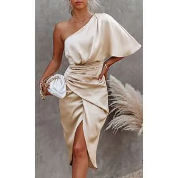 Womens One Shoulder Satin Dress Ruffle Sleeves Ruched Split Bandage Cocktail Dresses for Wedding Guest Gold M