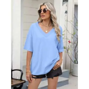 Show moreThe Womens Oversized T Shirts Ribbed Trim V Neck Short Sleeve Tops is the epitome of summer comfort and casual chic. Made with an exquisite blend of 95% cotton and 5% spandex, this tee offers a soft and stretchy feel that molds beautifully to your body while ensuring breathability, making it an ideal choice for those warm sunny days. This loose-fit tee flaunts a stylish deep V neck that enhances your neckline, providing both elegance and a hint of sass. Whether you're dressing it up for a night out or keeping it laid-back for a weekend escape, this versatile top is designed to meet the demands of modern life.