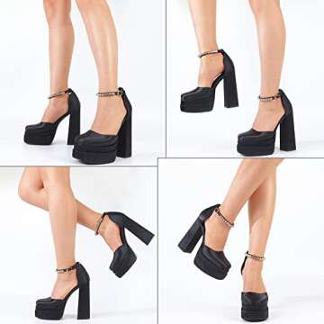 Show moreStep out in style and confidence with our stunning Womens Platform Dress Pumps. Crafted for the modern woman who embraces chic comfort, these ankle-strapped block high-heeled shoes are not only a fashion statement but also a versatile addition to your wardrobe. Made from luxurious silk satin, the shoes feature a square toe design that offers a contemporary flair, while the double platform enhances your height without sacrificing comfort. With a heel height of approximately 4.33 inches and a sturdy platform of 3 inches, these pumps are perfect for a variety of occasions, ensuring you look and feel fabulous wherever you go.