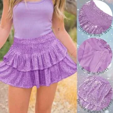 Womens Sequin Mini Skirt with Shorts Layered Ruffle High Waist Flowy Sparkly Glitter Skirt Purple S