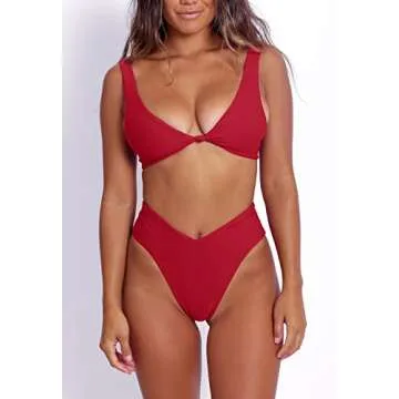 Womens Sexy V Neck Double Shoulder Knot Front Push Up Swimsuts Cheeky Brazilian Cut High Waisted Thong Bikini Set Red L