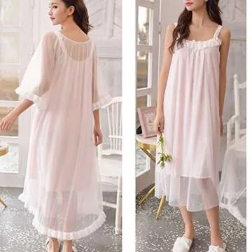 Womens Sexy Vintage Loungedress Nightgown 2 pcs Victorian Sleepwear Nightshirt Girls Pajamas (Light Pink)