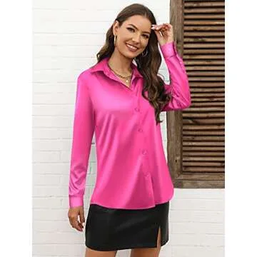 Womens Soft Satin Silk Button Down Shirts for Women Silky Long Sleeve Work Shirt Dress Blouses Tops Hot Pink L
