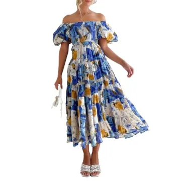 Womens Spring Summer Long Dresses Boho Floral Square Neck Midi Dress Puff Short Sleeve Tiered Maxi Dress Beach Sundress (Medium,Ice Blue Flowers)