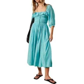 Womens Square Neck Dresses Puff Sleeve Ruffle Flowy Dress Party Wedding Guest Dress Beach Sundress, Blakc, Small