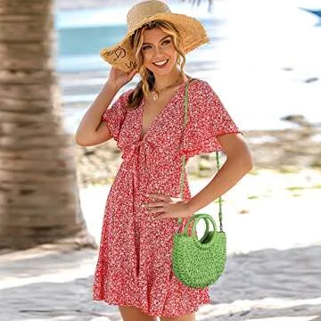 Introducing the Womens Straw Beach Bag Woven Crossbody Shoulder Bags Top Handle Satchel Handbag Purse for Summer, a stunning accessory designed for your vibrant summer adventures. Handcrafted from premium, high-quality natural straw, this bag is not just aesthetically pleasing but also built to last. Measuring approximately 7.48" H x 9.65" W x 2.76" D, it’s the perfect size to carry all your essentials without being cumbersome. Featuring a chic half-moon structure and delightful circle...