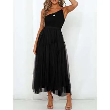 Womens Tulle Skirt A Line Pleated Midi Elastic Waist Mesh Flowy Chiffon Fairy Maxi Party Skirts Black