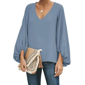 Womens V Neck Chiffon Blouses Casual Balloon Sleeve Floral Print Shirts Tops