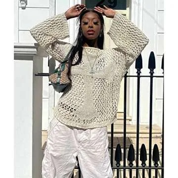 Womens Y2K Hollow Out Long Sleeve Tops Sexy Crochet Knit Crop Tops Mesh See Through Fishnet T-Shirt