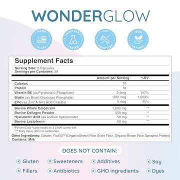 Formulated for Effective Beauty Revitalization: The rich ingredients in WonderGlow contribute to rejuvenating your beauty routine. Bovine colostrum, filled with growth factors, promotes skin cell regeneration while enhancing natural repair processes. Collagen aids in retaining hydration and improving skin structure, visibly reducing wrinkles and fine lines. Hyaluronic acid works to deeply hydrate and plump, enhancing skin texture, while biotin supports moisture retention and prevents dryness. Additionally, lactoferrin ensures that your skin defends itself against environmental aggressors, promoting a clearer, healthier complexion.