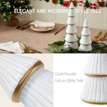 WONDROUS' DECO Tabletop White Christmas Tree Figurine, Artificial Wooden Christmas Tree Decorations Set of 2, Vintage Christmas Tree Gold Decor for Tables Centerpiece Home Farmhouse Mantel