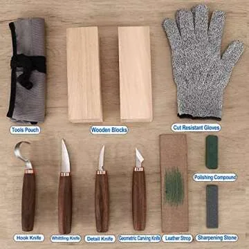 Wood Carving Tools Pack of 11- Includes Black Walnut Handle Wood Carving Knife,Whittling Knife,Hook Knife,Polishing Compound,Sharpening Stone,Cut Resistant Gloves,Wood Carving Kit for Beginners.