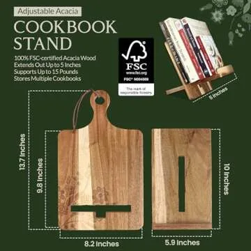 Show moreIntroducing the **Wood Cookbook Stand for Kitchen Counter**, a versatile kitchen companion that beautifully combines functionality with timeless design. This exceptional recipe book holder is made from premium acacia wood, known for its durability and stunning grain patterns. Whether you're following a cherished family recipe from a sauce-stained book or using a tablet for an online cooking class, this stand perfectly supports your culinary adventures. Its standout feature? A graceful reversible design, offering intricate Nordic flower patterns on one side and sleek minimalism on the other, allowing you to change up your kitchen's aesthetic effortlessly. It’s not just a recipe holder; it can moonlight as a cutting board or a classy serving board for cheese and charcuterie. Enjoy cooking with this stylish yet practical tool that elevates your kitchen experience to new heights.