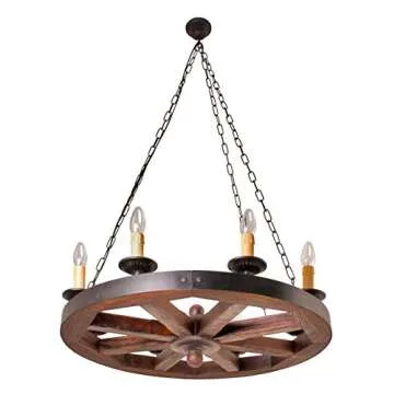 Show moreIlluminate your space with the stunning AIVENGO Wood Wheel Chandelier, a perfect blend of rustic charm and vintage elegance. This exquisite chandelier is designed to capture the essence of country living, featuring a unique wood wheel structure that adds character and warmth to any room. Crafted from high-quality materials, its durable design ensures it withstands the test of time while providing ample illumination for your home, restaurant, or bar. Whether you're aiming to revamp your dining area, create a cozy café atmosphere, or enhance the aesthetics of a hotel lobby, this chandelier promises to deliver a delightful touch of farmhouse decor.