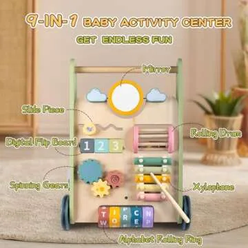 Show more Introducing the ultimate 9-in-1 Activity Center for your little ones, the ideal blend of fun and learning. This charming activity center is designed to captivate babies aged 6-12 months with its nine classic functions including a mirror, slide piece, digital flip board, spinning gears, rolling drum, xylophone, and an alphabet rolling ring. Each feature is crafted to engage, entertain, and stimulate your child's natural curiosity.