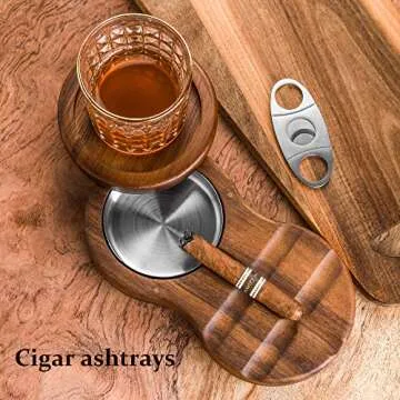 When it comes to cigar and whiskey accessories, our Wooden Cigar Coaster/Glass Tray stands out from competitors due to its unique design and functionality. Unlike traditional options, our revolving ashtray not only prevents soot from escaping but also enhances the overall aesthetic of your space. While many competitors focus solely on utility, our product emphasizes both form and function; it is a statement piece that draws attention while being incredibly practical. With easy maintenance thanks to the stainless steel liner, this set offers greater long-term value than typical ashtrays or coasters.