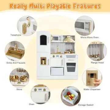 Show moreThe Wooden Kids Play Kitchen is a meticulously crafted culinary wonderland designed to ignite the imaginations of young chefs. This upgraded chef pretend play kitchen elevates playtime with its realistic lights and sound effects. Featuring an operational range hood, fully-functional stovetop, and a working faucet that lights up and mimics real water dispensing, it promises an immersive cooking experience. Your little ones will love the sense of authenticity while they engage in kitchen role play, exploring their culinary skills just like their grown-ups!