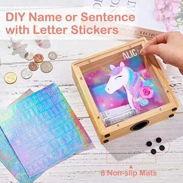 Wooden Piggy Bank for Kids Boys Girls, DIY Name Coin Bank Unicorn Dinosaur Money Bank with Letter Stickers