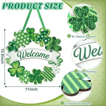 Show more Welcome a touch of festive cheer to your home with the exquisite St. Patrick Element Design Shamrock Door Wreath. This beautifully crafted decoration combines traditional elements such as stripes, plaid, polka dots, and shamrocks to create a vibrant yet tasteful aesthetic. The wreath's reasonable size makes it perfect for both indoor and outdoor display, easily transforming any entryway or living space into a celebration of St. Patrick's Day spirit.