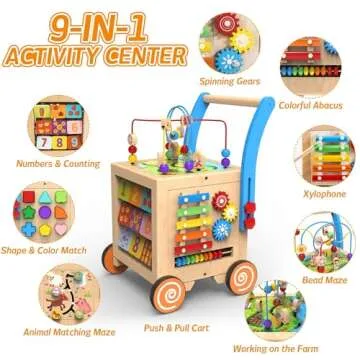 Show moreIntroducing the WOODMAM 9-in-1 Wooden Activity Cube, the quintessential learning companion for your little one’s first steps. This multifunctional wooden baby walker not only aids in mobility but also combines educational play seamlessly. With its unique design that features adjustable speed and height, this walker is tailored to grow alongside your child’s developmental journey. From toddlers embarking on their walking adventures to young explorers eager to engage with a variety of activities, the WOODMAM ensures that every step is both safe and enjoyable.