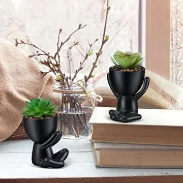 Show more Transform your space with these exquisite mini succulent plants, designed to infuse life and vibrancy into any home or office decor. These charming little plants offer a fantastic solution for those who wish to beautify their environment without the fuss of taking care of real plants. Adorned with unique human statue pots, they add a touch of personality and whimsy to your desk, living room, kitchen, or bathroom. Made with high-quality faux succulents, these plants maintain a fresh and lush appearance throughout the year, making them perfect for anyone with a busy lifestyle who still wants to enjoy the aesthetic of greenery.