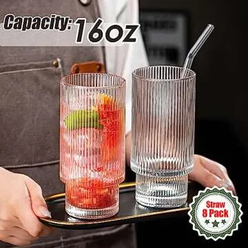 Show moreIntroducing the wookgreat Drinking Glasses – a sophisticated set of 8 origami style glass cups that blend quality and elegance into every sip. Each glass boasts a generous 16 oz capacity, making them perfect for everything from iced coffee to cocktails. Whether you are entertaining guests or simply enjoying a quiet evening at home, these ribbed highball glasses are not only functional but also a stunning addition to your tableware. Their unique origami design features a vintage twist that elevates any dining arrangement, making them perfect for both casual and formal occasions. Experience the joy of drinking while appreciating the artistry of these beautiful drinking glasses.