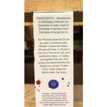 The key ingredients in the Woolzies Sandalwood essential oil include Sandalwood, Benzoin, Cedarwood, Vanilla, and Bergamot.
