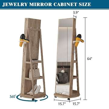 Show more Discover the ultimate solution for organizing and displaying your jewelry with the WOOVIVS 360 Rotating Jewelry Armoire with Mirror. Designed for functionality and style, this elegant standing jewelry cabinet boasts a full-length mirror that adds a touch of sophistication to any room while providing a complete view for your outfits. With an astounding array of storage options including 108 earring slots, 60 ring slots, and dedicated sections for necklaces, bracelets, and cosmetics, this armoire is perfect for anyone looking to keep their treasures secure and easily accessible.
