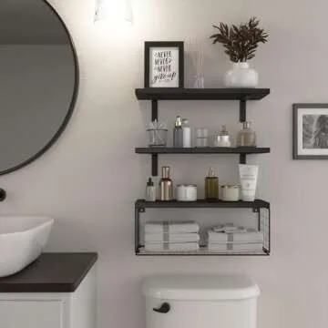 WOPITUES Bathroom Shelf Over Toilet, Floating Bathroom Shelf Wall Mounted with Wire Basket, Floating Shelf for Wall Décor-Black