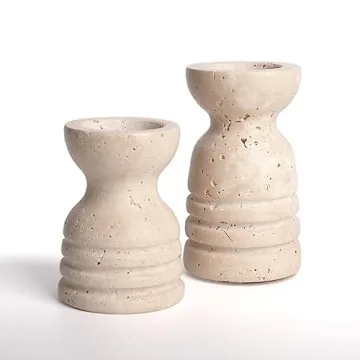 WORHE Candle Holders Crafted from Italy's Natural Travertine Marble Set of 2 for 3/4" Taper Candles in Beige