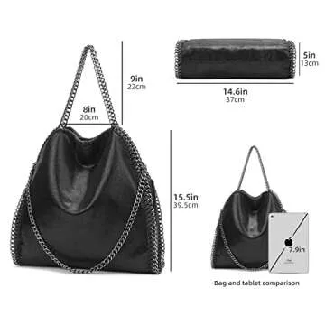 Show moreMeet your new favorite accessory, the Work Bags for Women Fashion Large Tote Bag. This exquisite black tote is designed for the modern woman who needs functionality without sacrificing style. Its elegant structure and striking silver/gunmetal chain details make it the perfect companion for both work and leisure. Crafted from high-quality materials, this bag is not only chic but also incredibly durable, ensuring it withstands daily wear and tear. With ample storage space to carry all your essentials, it seamlessly transitions from day to night while keeping you organized and fashionable.