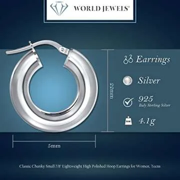 World Jewels 925 Sterling Silver Chunky Small 7/8" Round Hoop Earrings for Women - Italian Made, Lightweight Hoop Earrings, Silver Hoop Earrings for Women - Hoop Earring Gifts for Women and Teens