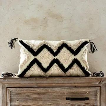 Show moreElevate the aesthetic of your home with the Woven Tufted Boho Lumbar Throw Pillow Cover. This stunning piece combines style and functionality, measuring 12 x 20 inches and made from 100% premium cotton canvas. Designed with an eye-catching mix of black and white geometric chevron lines, it features hand-knotted fringes that deliver an unparalleled texture and charm. Whether your decor leans more towards rustic or bohemian, this pillow cover will naturally complement and enhance your space, ensuring an inviting atmosphere in every room.