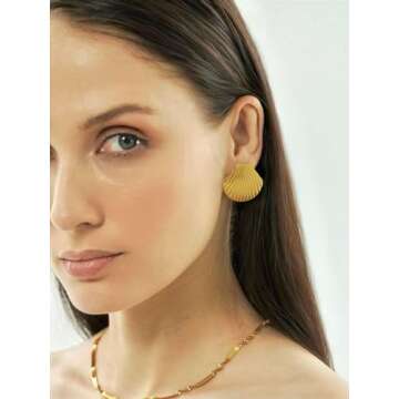 WOWORAMA Gold Seashell Earrings for Women Striped Large Scallop Shell Earring Vintage Big Sea Shell Stud Earrings Boho Summer Beach Statement Earring