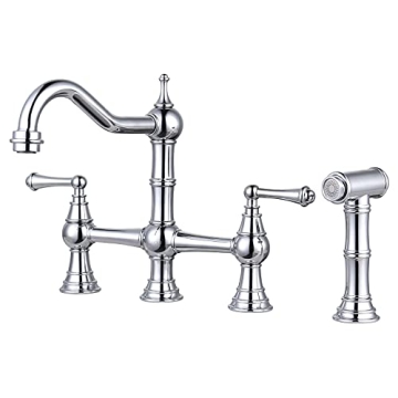 Show moreTransform your kitchen with the WOWOW 4 Hole Kitchen Faucet with Sprayer, an exceptional blend of elegance, durability, and practicality. Crafted from robust solid brass, this bridge faucet is built to endure daily use while offering an impressive 7.76 lbs weight that exudes quality and sturdiness. Its stunning chrome finish not only elevates your kitchen's aesthetic but also provides a layer of rust and corrosion resistance, ensuring your faucet remains beautiful and functional for years to come.