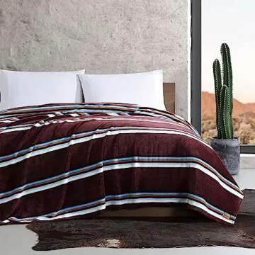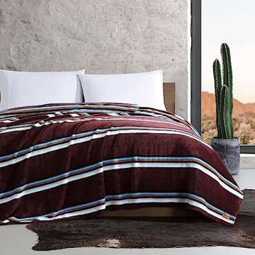 Show moreTransform your home into a cozy retreat with the Wrangler Blanket Ultra Soft Plush Fleece. This luxurious blanket measures 90"L x 108"W and is designed to bring the rugged charm of the American West right into your home. Crafted with 100% Premium Polyester Plush, it offers an ultra-soft and cozy feel, ensuring warmth and comfort whether draped over your bed or adorning your couch. The stylish Western Saddle Stripe in red adds a pop of color and personality, making it a perfect statement piece for any décor. Wrapped in self-hem detailing and accented with an iconic Wrangler branded logo patch in faux leather, this blanket harmonizes durability with elegance, creating a true masterpiece that reflects your adventurous spirit.