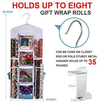 Show moreIntroducing the Wrapping Paper Storage Holder Double-Sided Hanging Gift Bag and Gift Wrap Organizer – your ultimate solution to chaotic gift wrapping supplies! Made from premium 600D Oxford polyester and thick transparent PVC, this organizer is designed not just for durability, but also for practicality. The ability to rotate the hook 360 degrees enhances accessibility, allowing you to effortlessly reach your materials. Measuring 16 x 38 inches, it accommodates a variety of wrapping paper sizes while ensuring your storage space remains neat and organized.