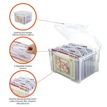 Show moreMeet the WRVCSS Greeting Card Storage & Organizer Box, your ultimate solution to maintaining an organized and accessible collection of greeting cards! Crafted from durable PP material, this box boasts exceptional sturdiness while ensuring that your cards remain protected for years to come. Featuring six adjustable removable dividers, customize your storage to fit various card sizes—whether they are birthday wishes, get-well notes or holiday greetings. The clear design offers visibility at a glance, so you can always see what cards you have on hand without the hassle of rummaging through cluttered drawers.