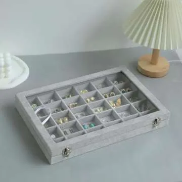 Wudygirl 30 Grid Jewelry Organizer Velvet Jewelry Box Jewelry Tray with Clear Lid Storage Case Showcase Display Stackable Removable (30 Grid)
