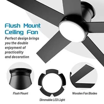 Show more Introducing the ultimate in modern home cooling solutions - the Flush Mount Ceiling Fan. This stylish and contemporary ceiling fan features a sleek metal motor housing paired with five beautifully crafted black wooden fan blades that not only enhance your room's aesthetics but also offer exceptional performance. The integrated acrylic cover combined with a flicker-free LED light source ensures a soft, pleasant glow that brightens your space without overwhelming it.
