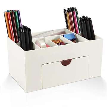Show moreTransform your workspace with the WWXICLG Desk Organizer, a stylish and functional solution designed to keep your office essentials neatly arranged and easily accessible. Crafted from high-quality, environmentally friendly ABS plastic, this desk organizer is both durable and aesthetically pleasing, making it an ideal addition to any desktop. Measuring 8.6 x 4.6 x 4.1 inches, it features a unique design with 8 multi-compartments and a convenient sliding drawer. Whether you need to store pens, pencils, markers, or other small accessories, this organizer helps you maintain a clutter-free workspace while complementing your office decor.